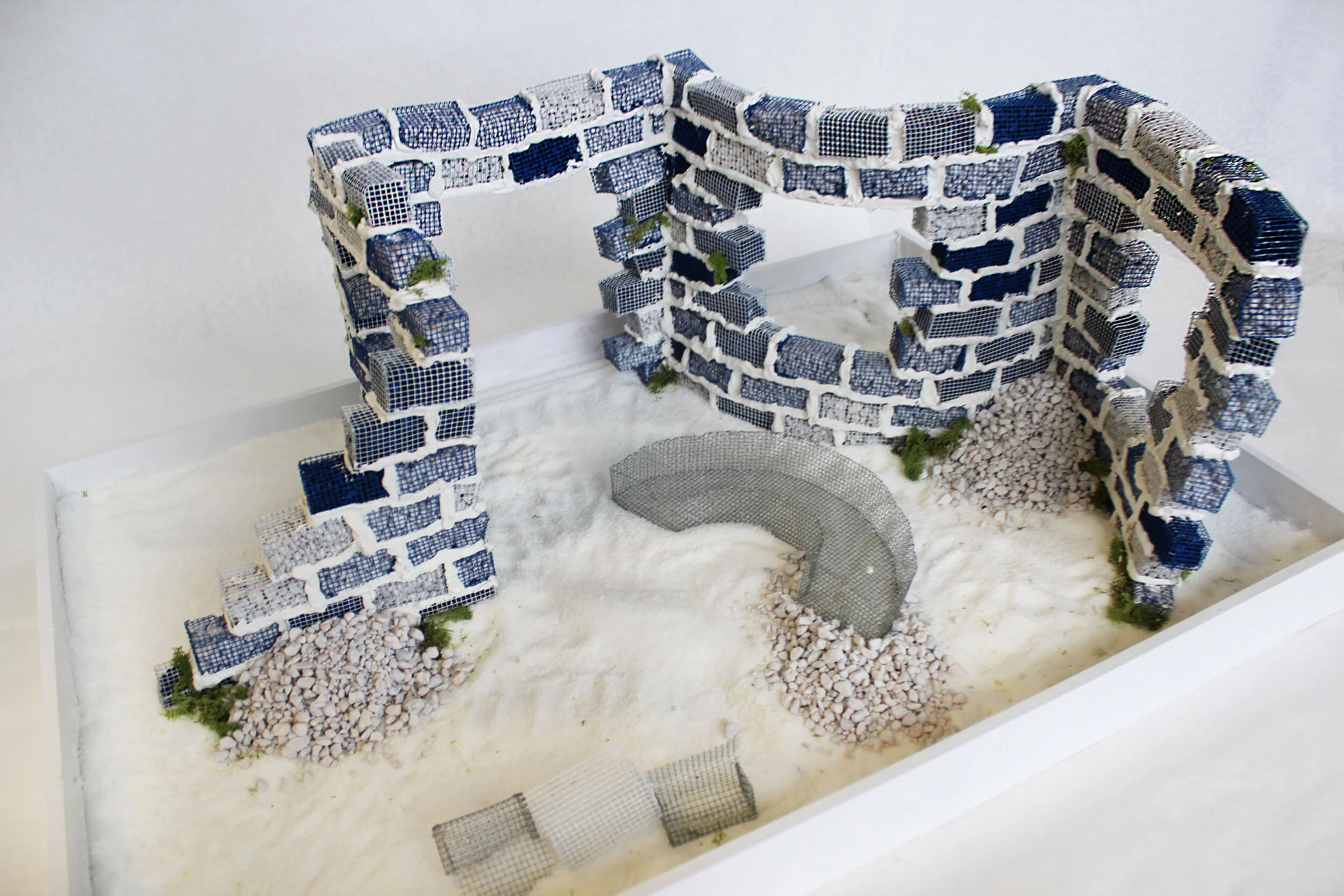 Rock Blocks is a box store which sells blocks and is made of blocks. These blocks are made of meshes which contain the ground beneath the architecture. The meshes come in various porosities so that this box store could be sited anywhere. This excavation project thinks about architecture and its relationship to site and materials.